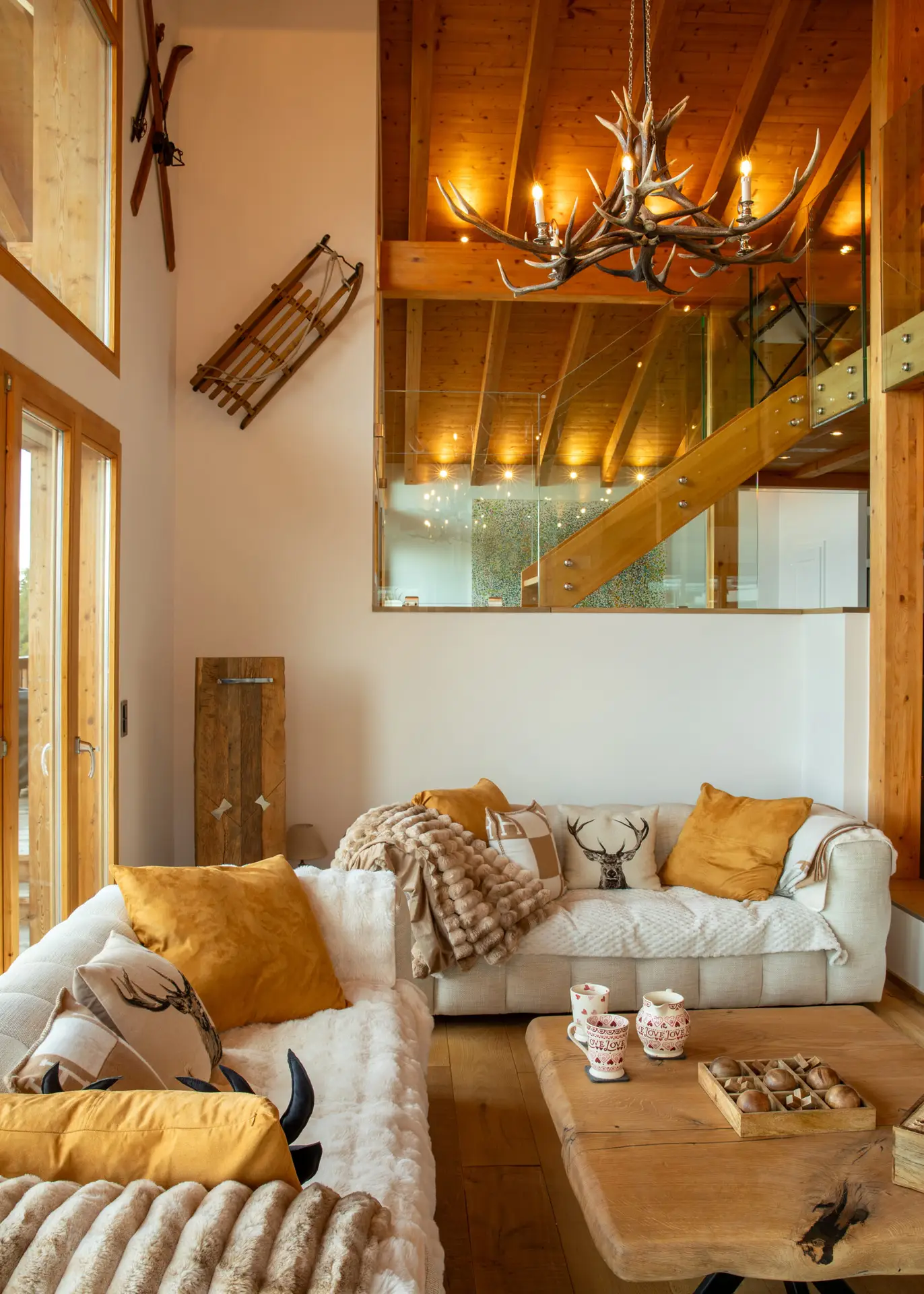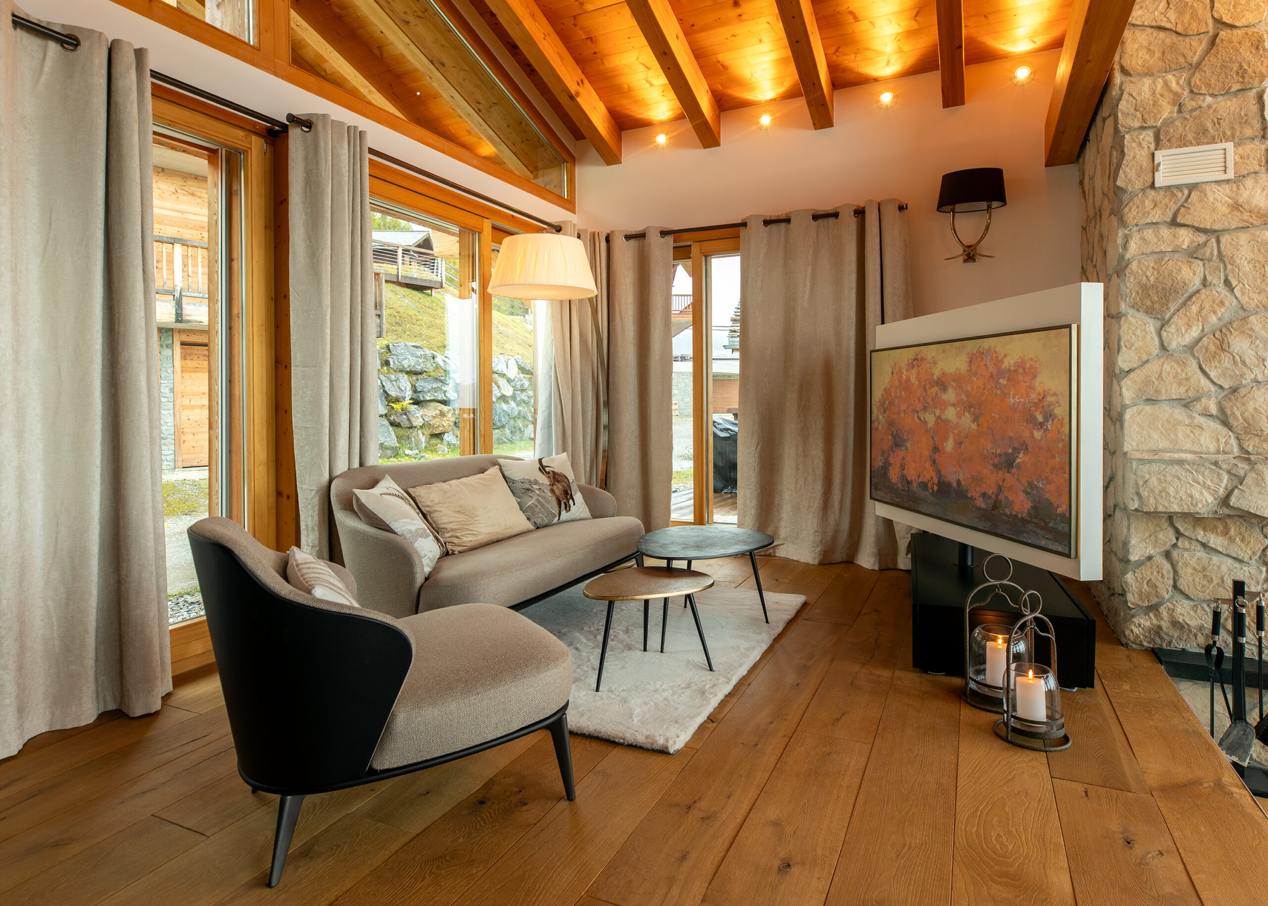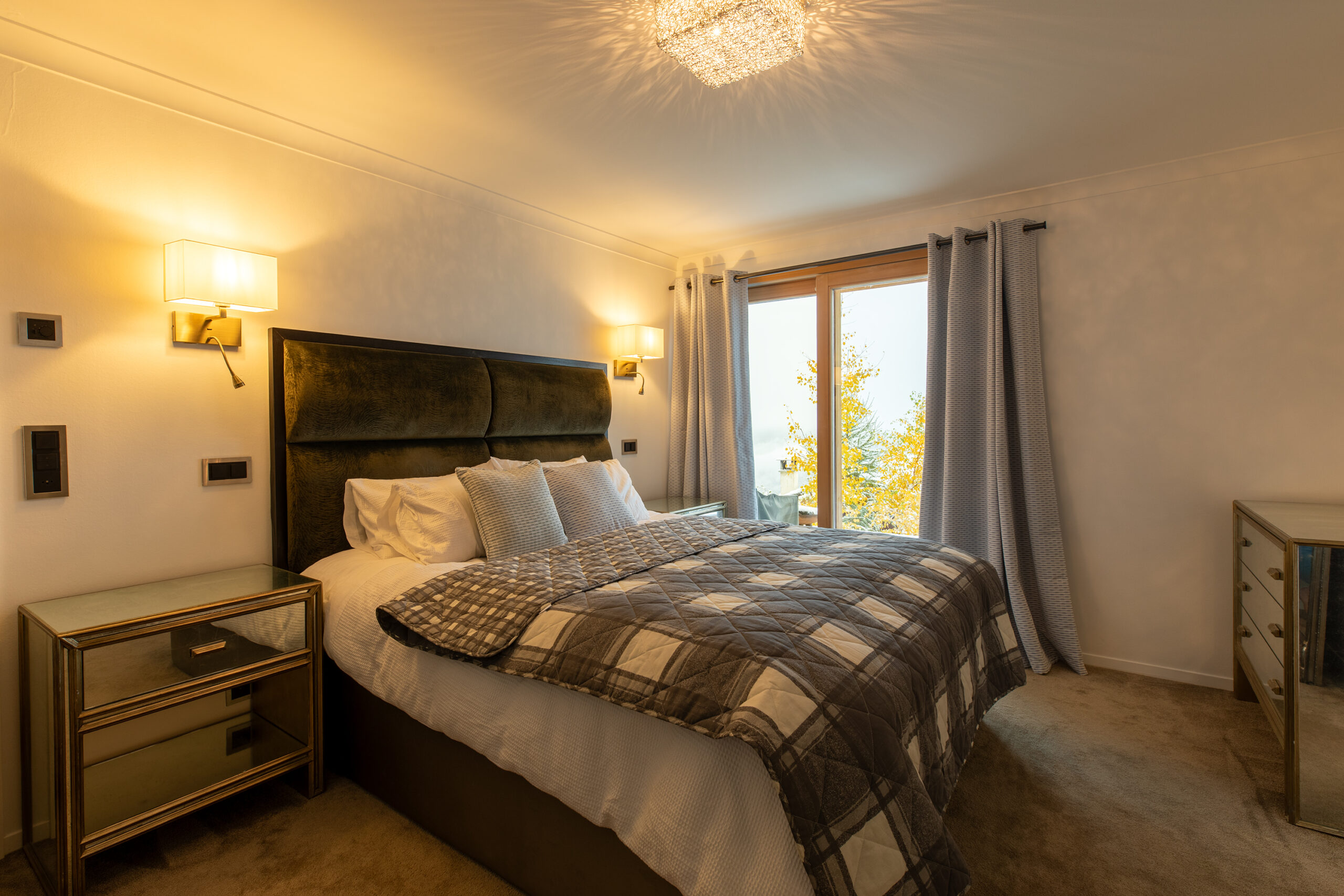 Soft textiles, natural wood tones, and statement lighting create a cozy yet sophisticated atmosphere throughout, perfectly matched to the panoramic mountain views visible from every room.