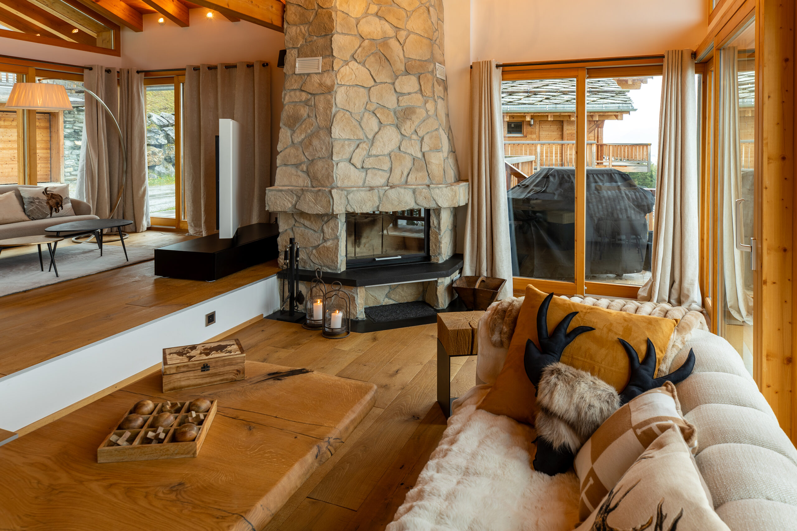 Unwind in the spacious open plan living area, complete with plush seating, a grand stone fireplace, and floor-to-ceiling windows that bathe the room in natural light. Multiple lounge corners provide the perfect places to curl up with a book, enjoy a glass of wine, or gather for a relaxed evening after a day outdoors.